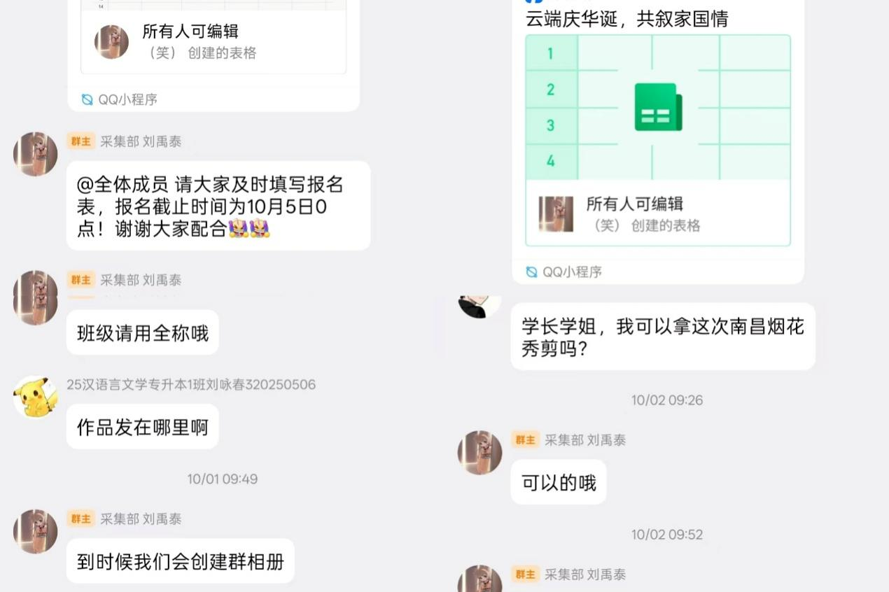 为庆祝中华人民共和国成立76周年,9月30日,由永利集团3044noc登录入口组织开展的“云端庆华诞,共叙家国情”——“我的家国记忆”短视频征集活动正式拉开帷幕,此次活动采用线上模式,面向全校学子发出诚挚邀约,鼓励大家用镜头捕捉时代变迁下的个体感悟,用影像铭刻那份深植于心的家国情怀。活动伊始,为保障“云端庆华诞,共叙家国情”活动的顺利开展,准备工作从QQ建群、名单统计、技术保障、作品收集等多方面精心规划。在工作人员的引导下,参与活动的同学们踊跃分享个人作品,积极讨论活动内容,同时在活动持续期间内工作人员及时地为各位同学解答相关疑惑。本次活动通过线上交流与视频分享展现了家是最小国国是千万家,用青春的视角,为时代留影,为家国存证,携手谱写属于我们这一代人的家国记忆华章。活动鼓励同学们走出课堂,关注社会变迁,感受时代脉搏,通过独特的青年视角和创新的视听语言,挖掘并展现那些蕴含在日常生活里、体现在城乡风貌变化中、凝聚在民族情感深处的家国故事。(图/采集部文/符思鑫初审/龙少帅二审/黄金标终审/江建华)